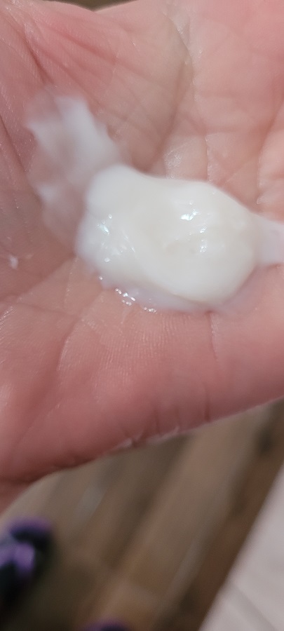 O perfume é bem suave, cheira a delicadeza da cor da embalagem rosa bebê. A textura da máscara é média, sendo bem homogênea, o que facilita a aplicação, com uma cor leitosa e perolada.