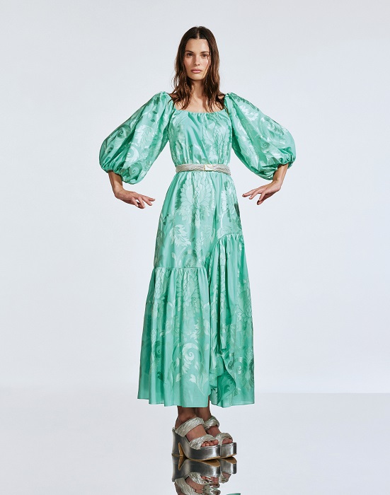 Vestidos longos, com fendas, com ombros à mostra ou em formato máxi bufante se juntam às saias longas, tops, camisas, moda praia, calças, manteaux e shorts em um plano de fundo solar e refinado.