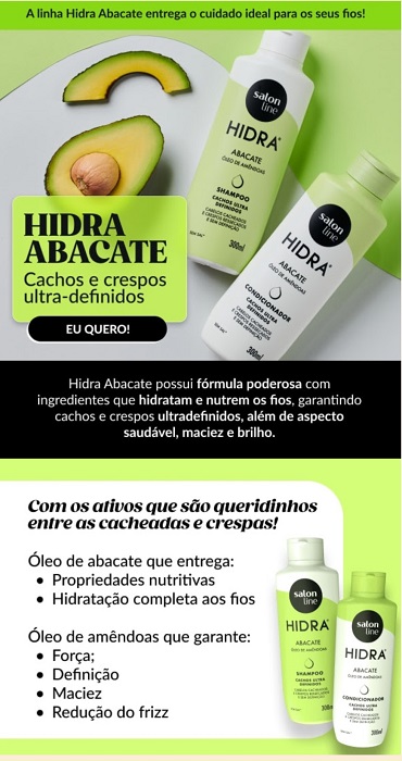 - A linha Hidra Abacate é indicada para cabelos crespos e cacheados e tem como princípio ativo do óleo de abacate, nutre e hidrata; além do óleo de amêndoas que dá maciez, força, resistência controle do frizz.