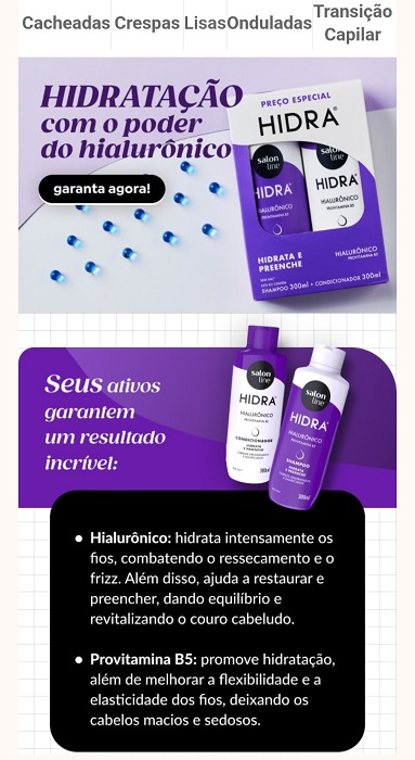 - A linha Hidra com o princípio ativo do ácido hialurônico e provitamina B5 indicada para cabelos desidratados e danificados promove hidratação intensa, deixa os fios mais flexíveis e com mais elasticidade, controle do frizz e combate o ressecamento, revigora a fibra capilar deixando os cabelos macios e sedosos.