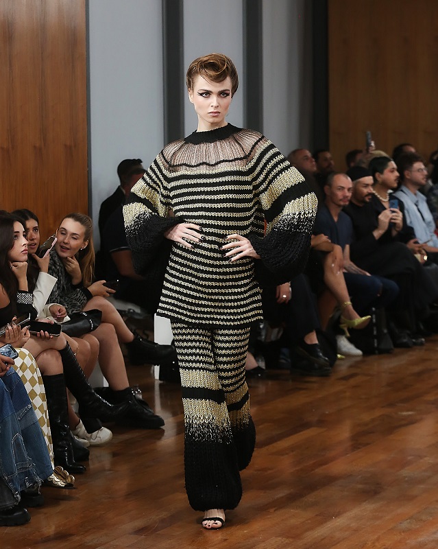 Um fetichismo pulsante permeou a coleção AL07 de André Lima. O tricô consciente deu forma a peças com recortes geométricos generosos, ora em linhas retas, ora em círculos, além da malharia retilínea, ponto forte da coleção, que apareceu em blends sofisticados, que têm na estrutura, tecidos desenvolvidos com os fios sustentáveis da marca REPREVE®️ + seda e algodão.