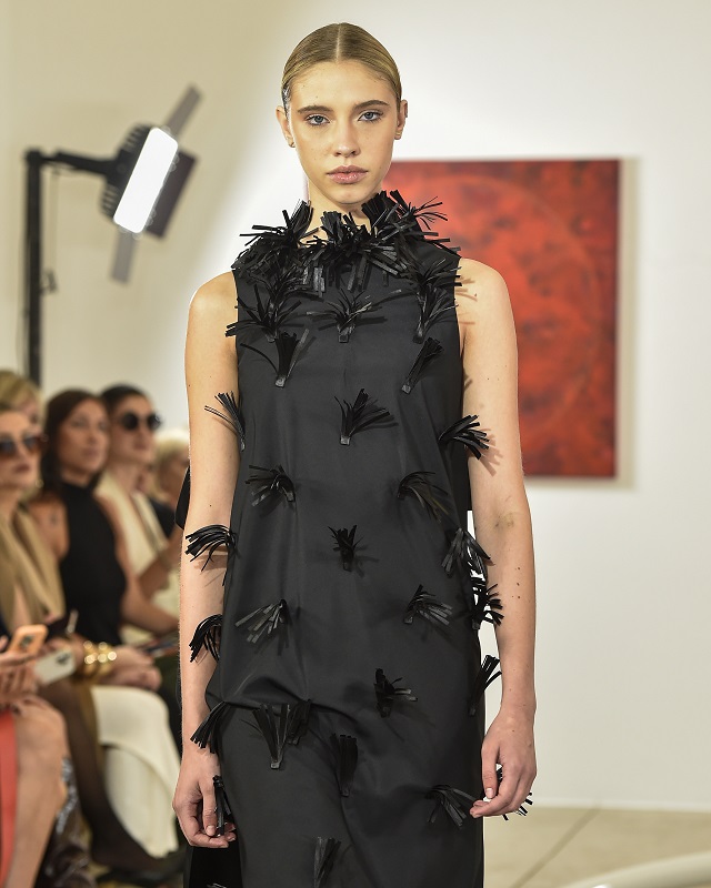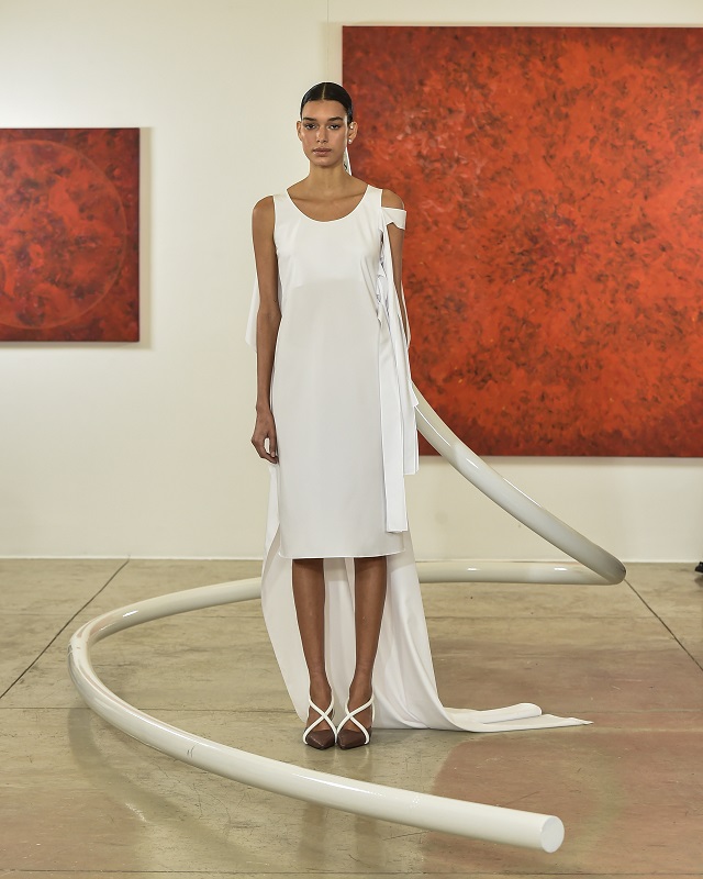Gloria Coelho surpreendeu ao criar 04 looks modernos de festa com silhueta minimalista, a partir de tecido feito dos fios de garrafas PET recicladas REPREVE®️. As peças enfatizam os recortes geométricos e aparecem nos tons preto e branco, em versões bordadas e lisas.