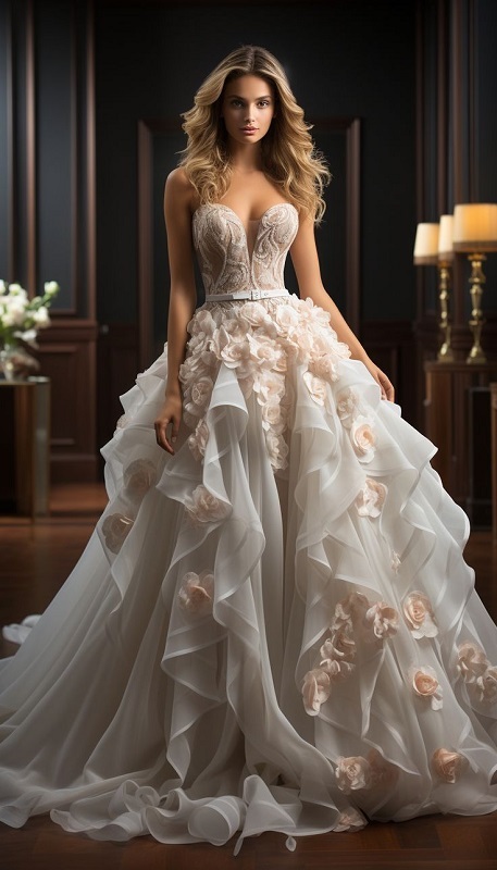 Seja com mangas longas ou sem mangas, com decote em V e/ou em formato de Coração, como decote redondo e/ou quadrado, de alças ou no maior estilo princesa (ombro à ombro); o tronco é revestido numa tendência rendada floral e cheia de sensualidade, que muitas vezes, envolve transparência também. O volume fica por conta da saia, que geralmente é produzida em camadas de tule, mas há modelos com saias retas e lisas, ou no estilo sereia também.