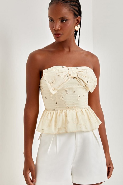 A ideia é que não seja obrigatoriamente usar-se apenas uma peça com o laço, mas despojá-lo com outras peças de roupas mais casuais, do tipo uma minissaia jeans ou couro, uma calça jeans ou uma legging, um shorts de alfaiataria ou um jeans destroyed, já ajuda a quebrar o look fatal com algo mais democrático para o dia a dia.