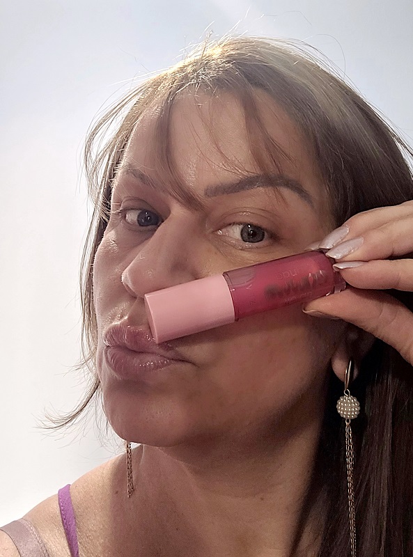 Estou realmente viciada neste brilho suave, com uma essência de chiclete de morango maravilhosaaa e um pincel em formato de pata (grande e anatômico) e que adere facilmente aos lábios e o melhor, com pouca quantidade desliza e uniformiza totalmente a boca.